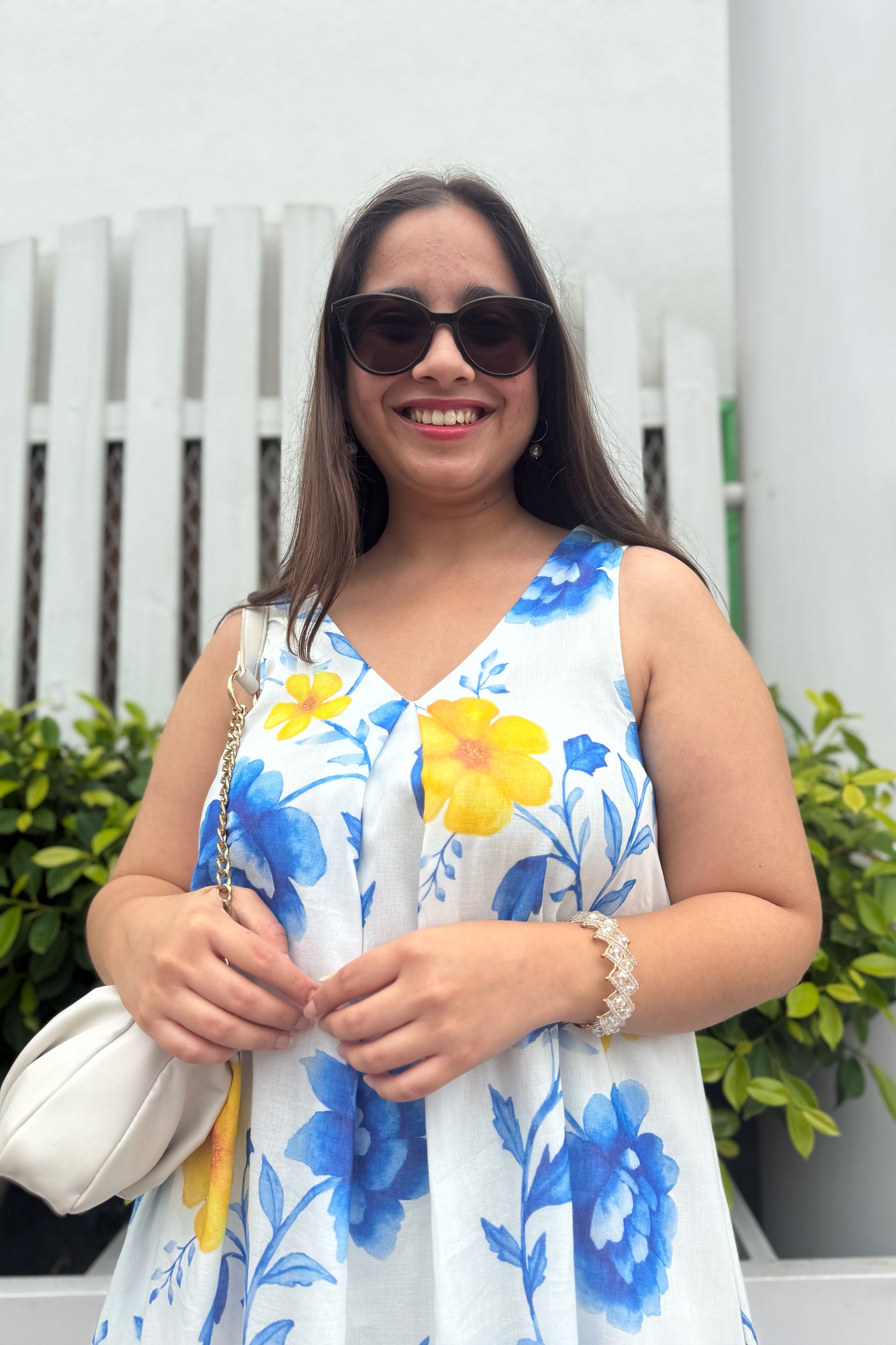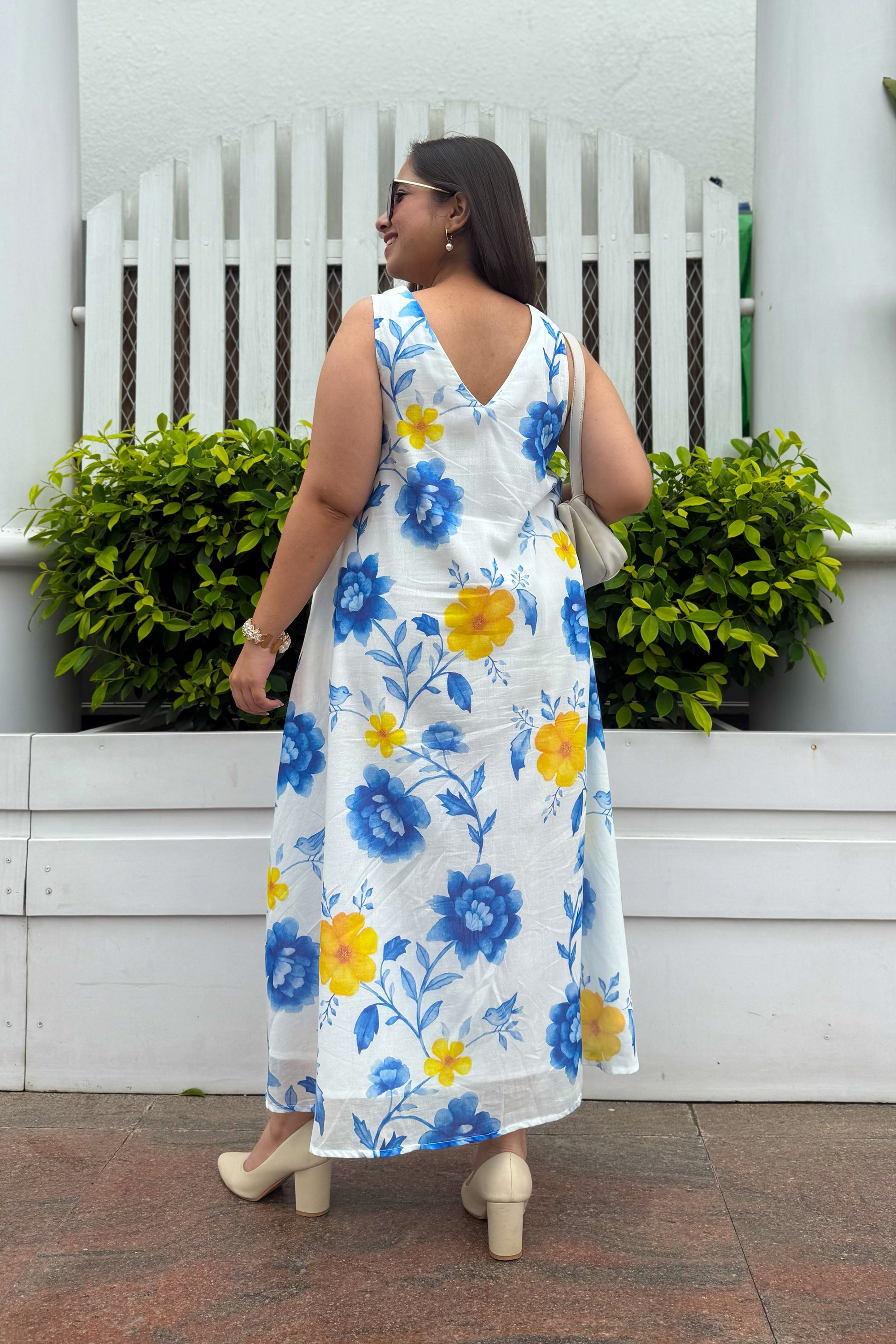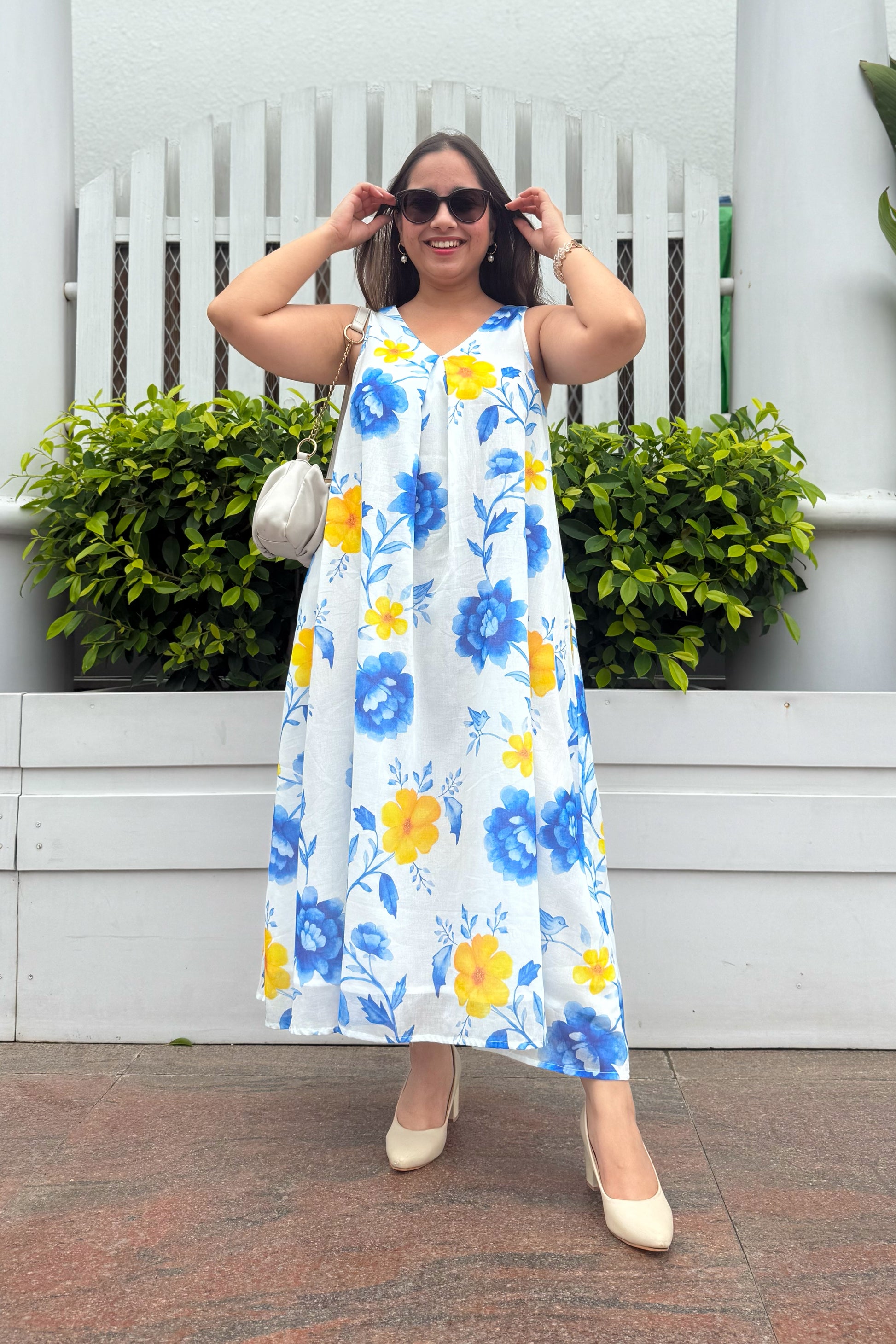 The soothing blue print captures the calm of clear skies, while the sleeveless A-line silhouette flatters effortlessly — flowing with ease and grace. Thoughtful details like a soft V-neckline and side pockets make it equal parts stylish and functional.
