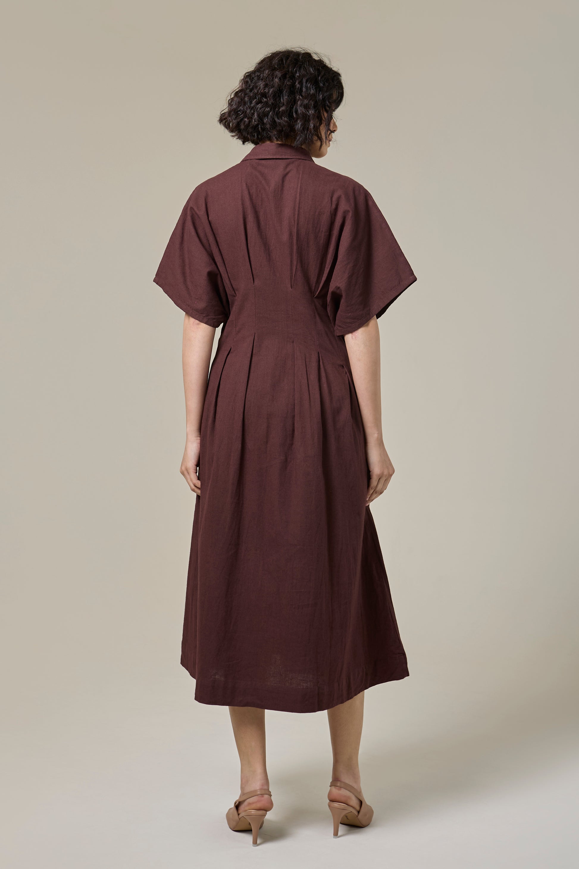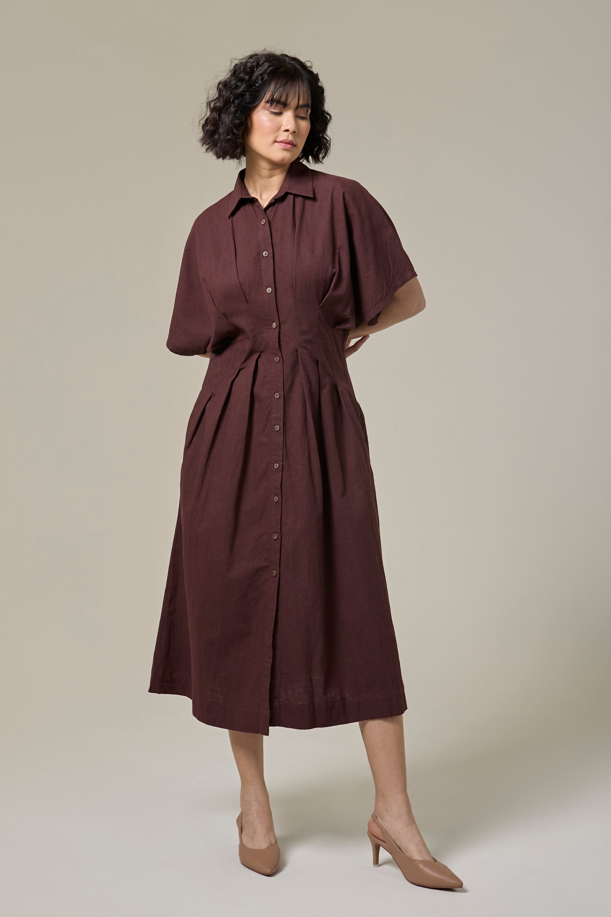 Rooted in simplicity, the Mocha Brown Monk Dress reflects the quiet beauty of the earth. Tailored from hand-dyed cotton-linen in a deep, mellow mocha, it pairs a sharp collared neckline with easy kimono-style sleeves and a softly cinched waist that unfolds into a flowing, pleated skirt.