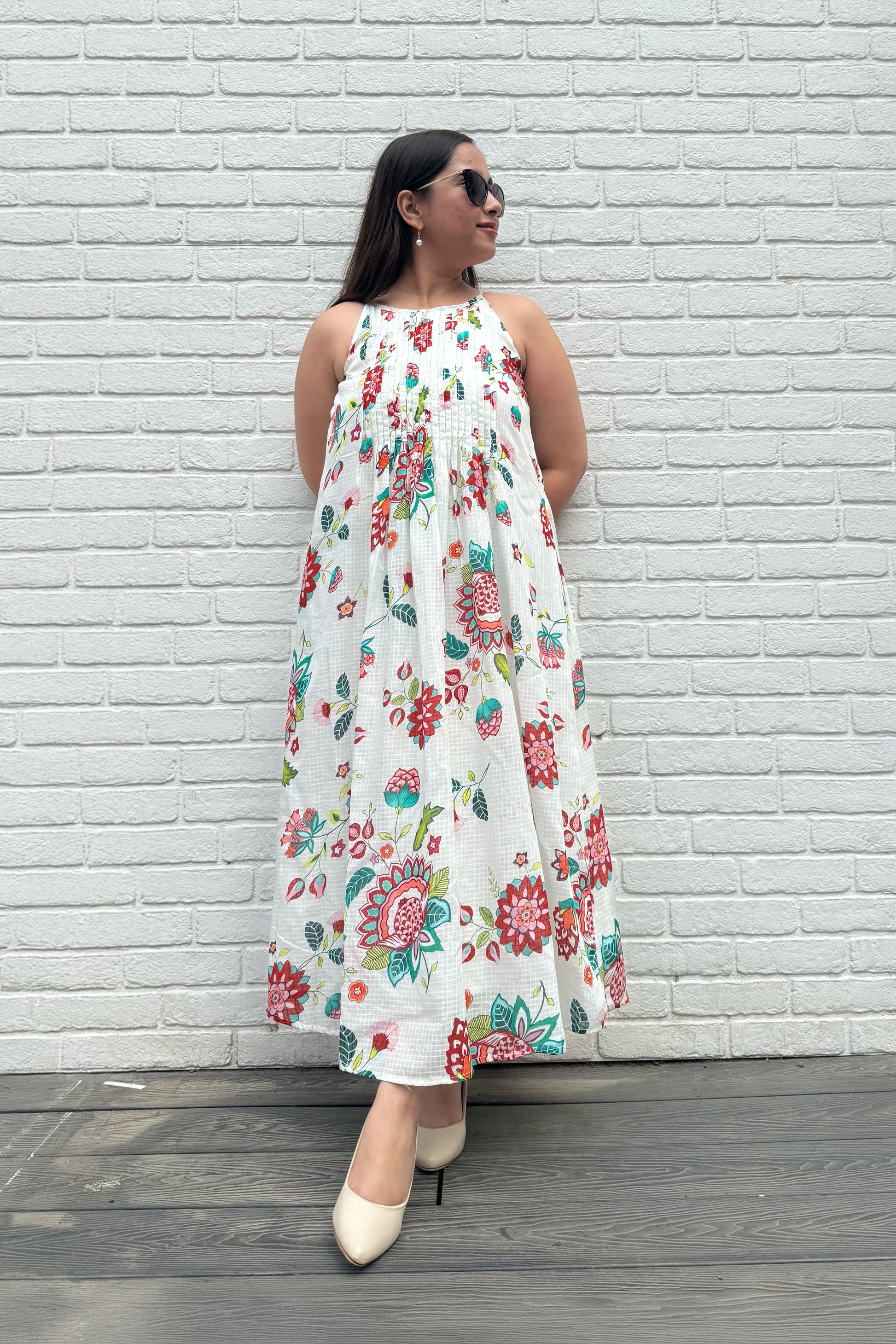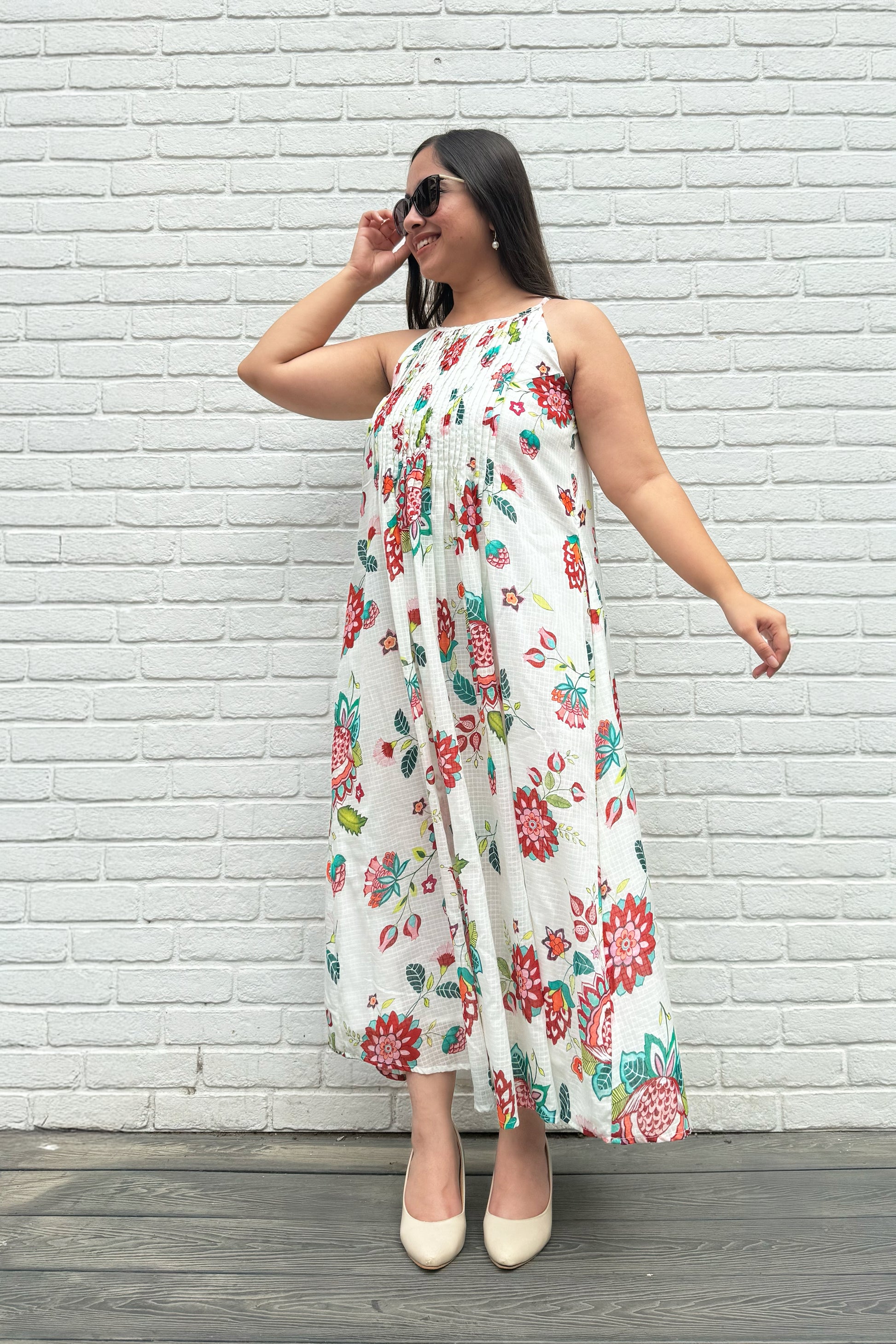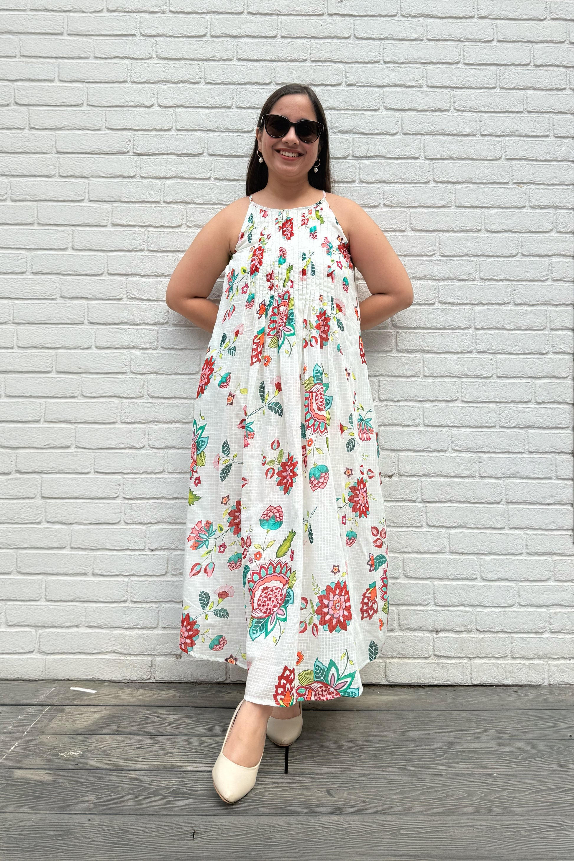 Crafted in airy Cotton Kota Doria and lined with ultra-soft mulmul, it feels light, breathable, and gentle on the skin. The halter neckline adds a modern touch, the delicate front pin tucks bring soft texture, and the flared hem moves beautifully with every step.