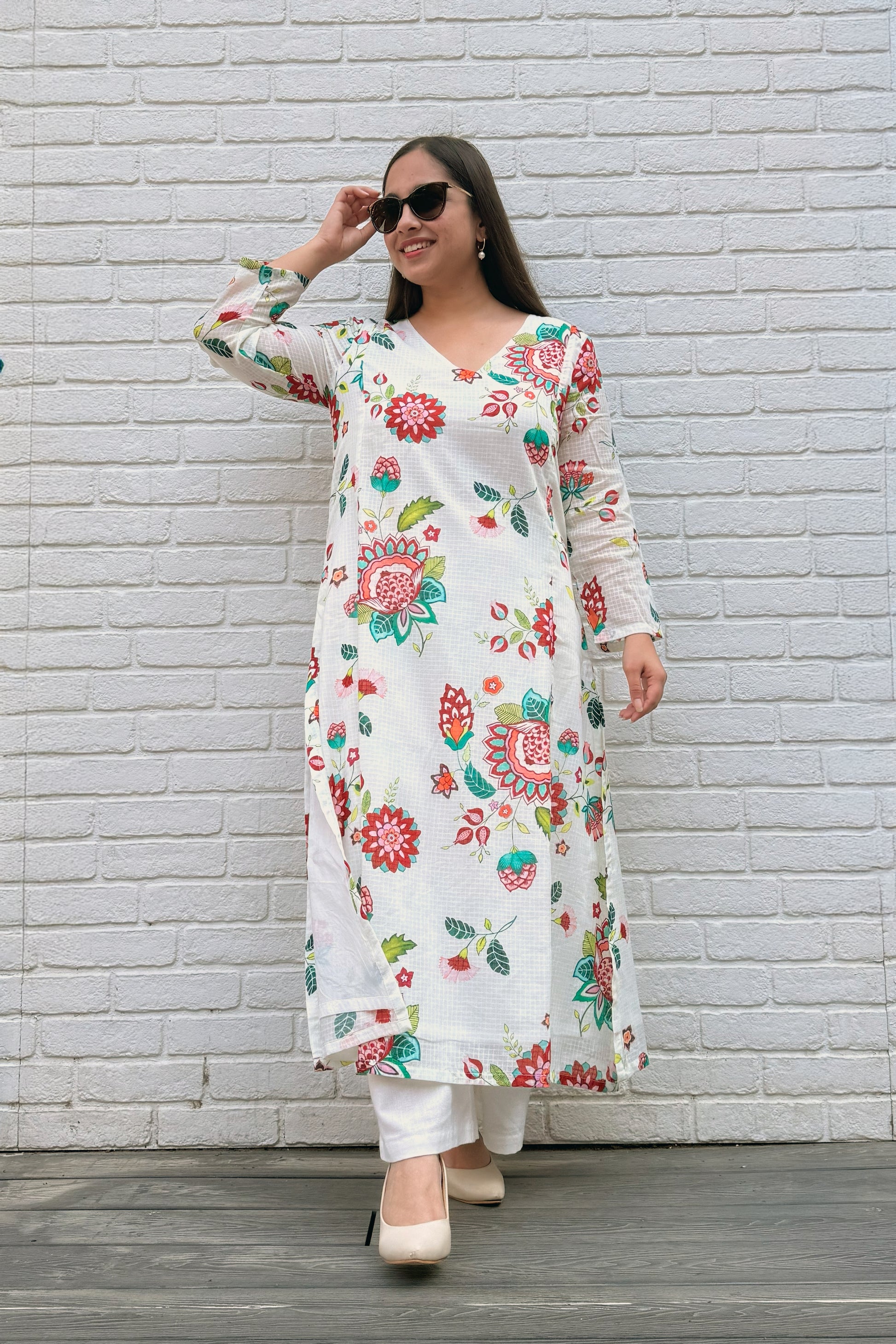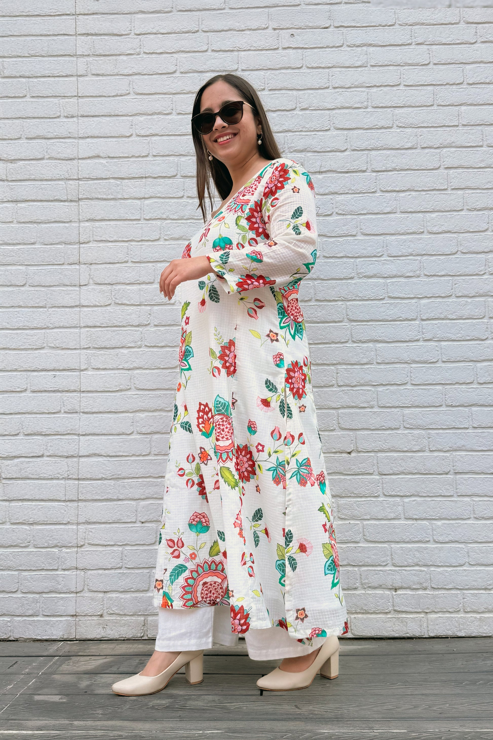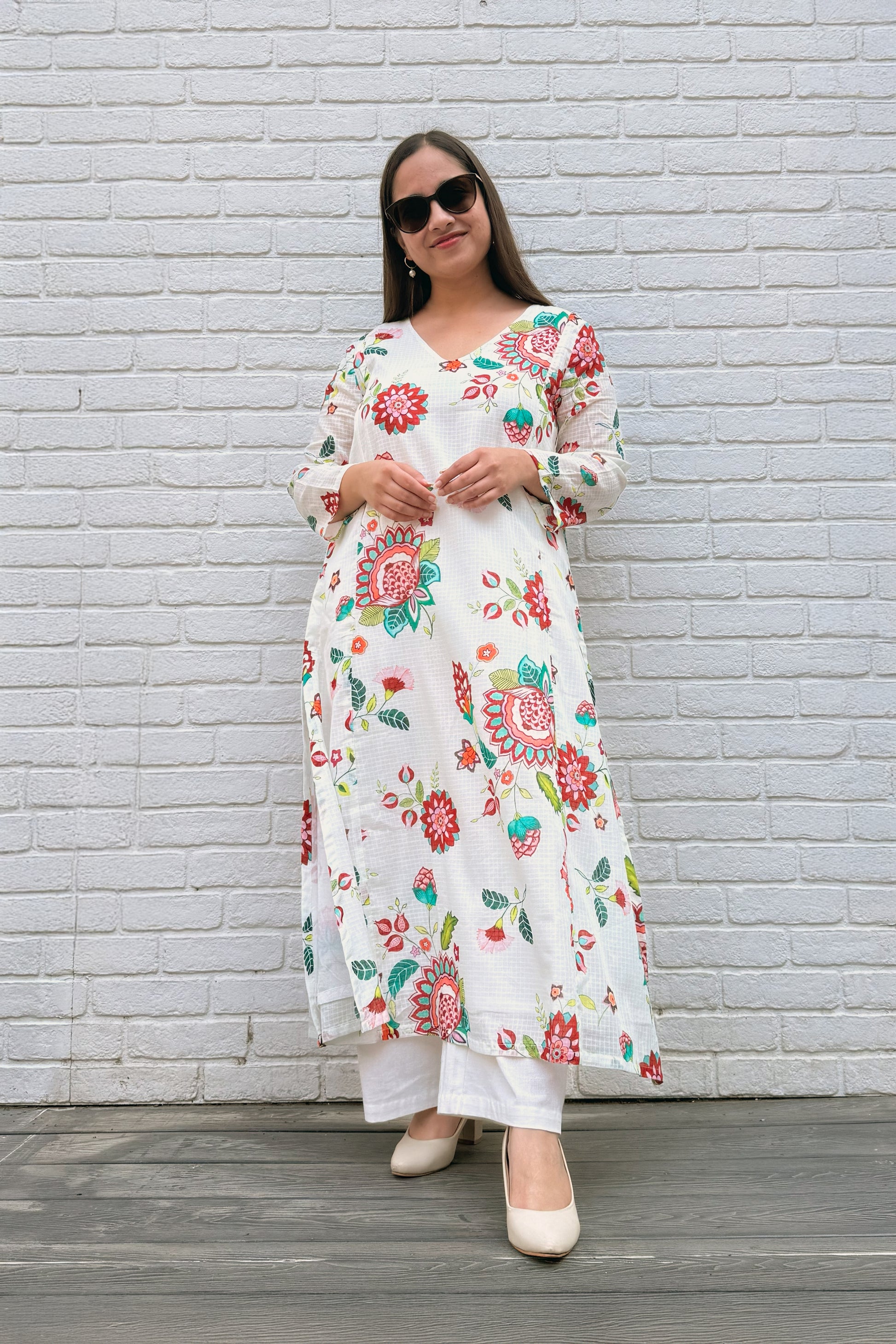 Crafted in airy Cotton Kota Doria and lined with the softest cotton mulmul, this kurta features a relaxed silhouette that drapes beautifully on the body. The intricate Gul print adds a touch of romance and heritage, while the matching cotton pants complete the look with ease and refinement.
