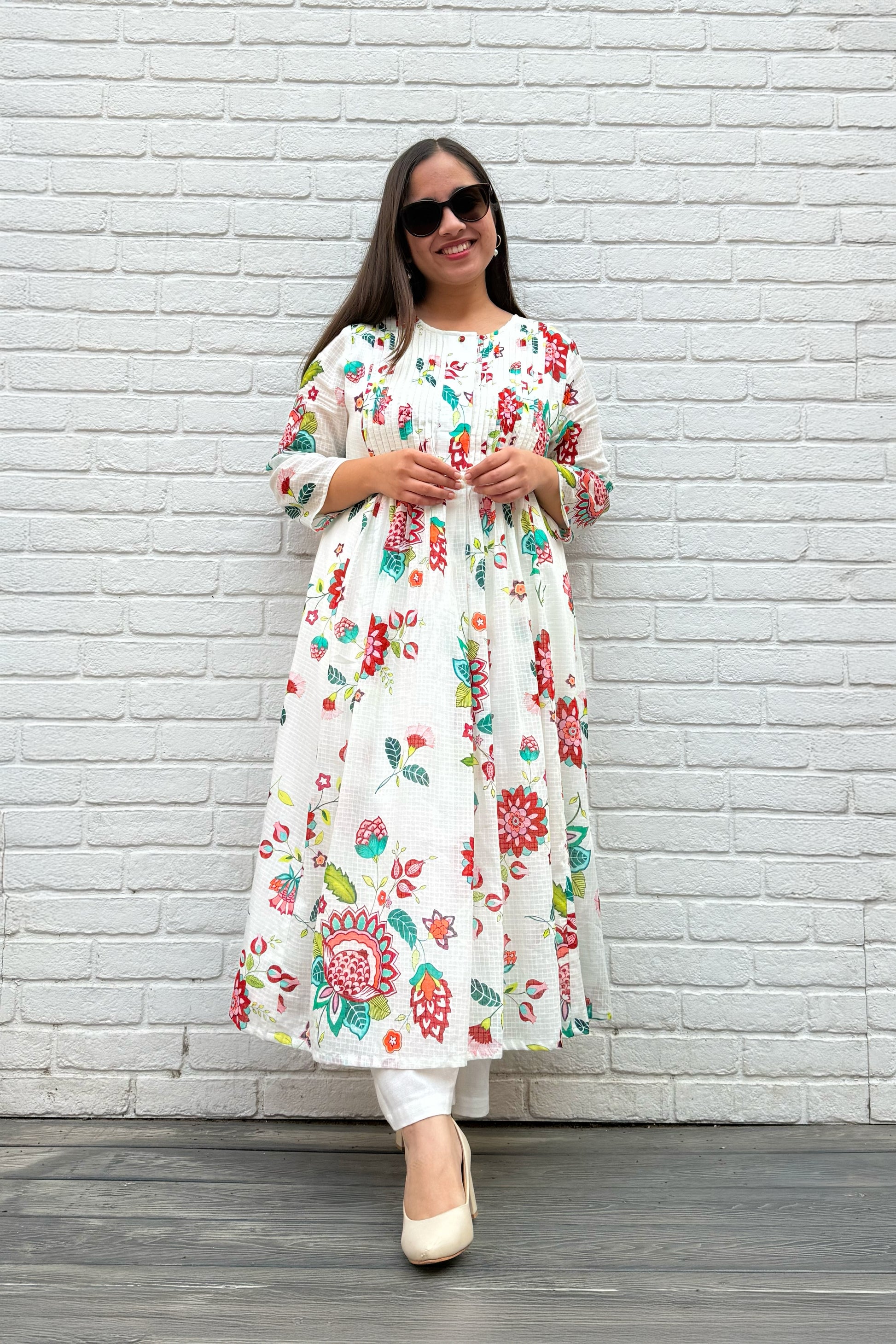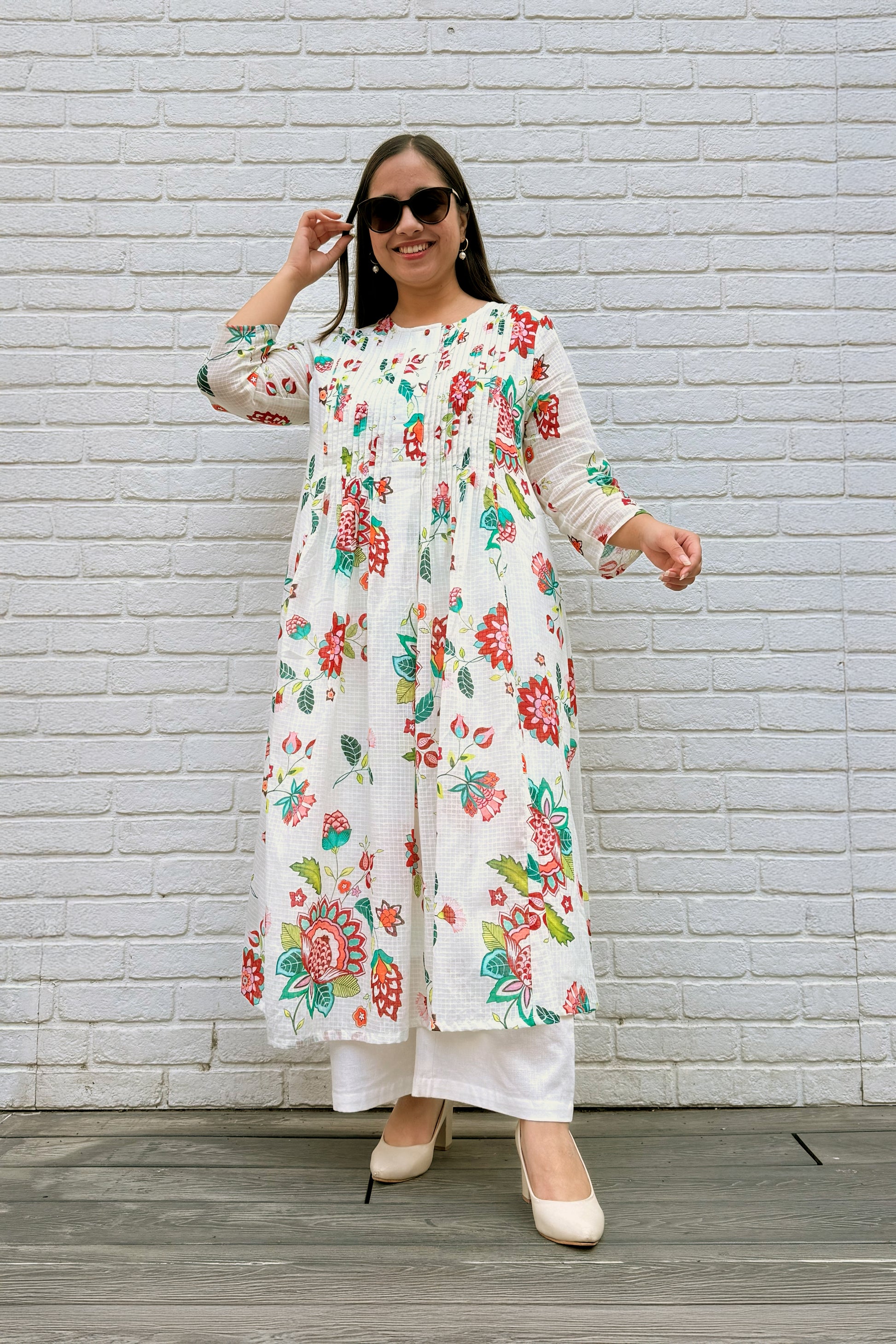 Crafted in soft, breathable Cotton Kota Doria and fully lined with fine cotton mulmul, the kurta features delicate pin tucks along the front and handcrafted fabric buttons that add a touch of charm. Paired with matching cotton pants, this set blends tradition with modern minimalism.