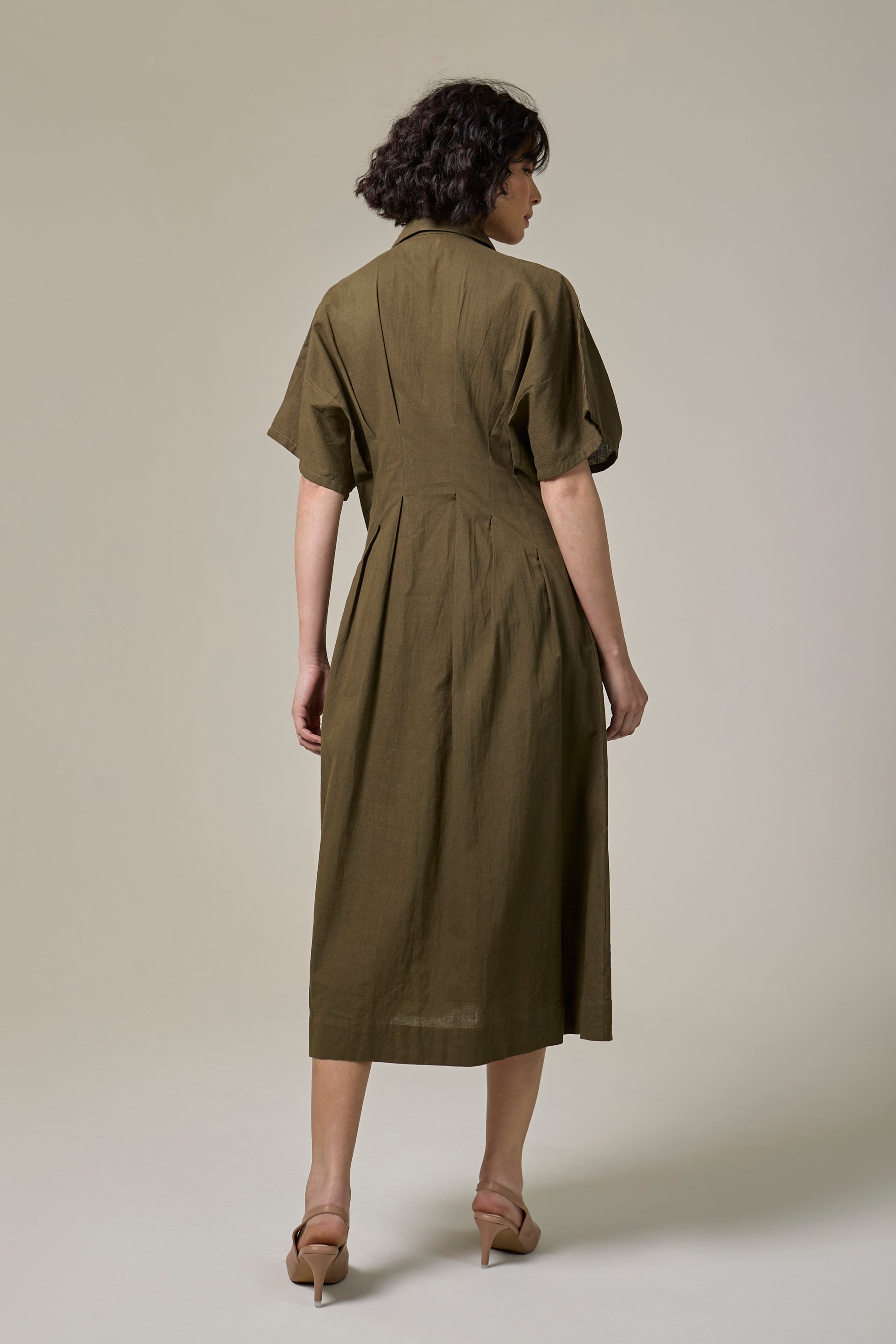 Its cotton-linen blend ensures breathability while the earthy olive tone pairs effortlessly with both neutrals and color pops. A dress made for movement — in body and spirit.