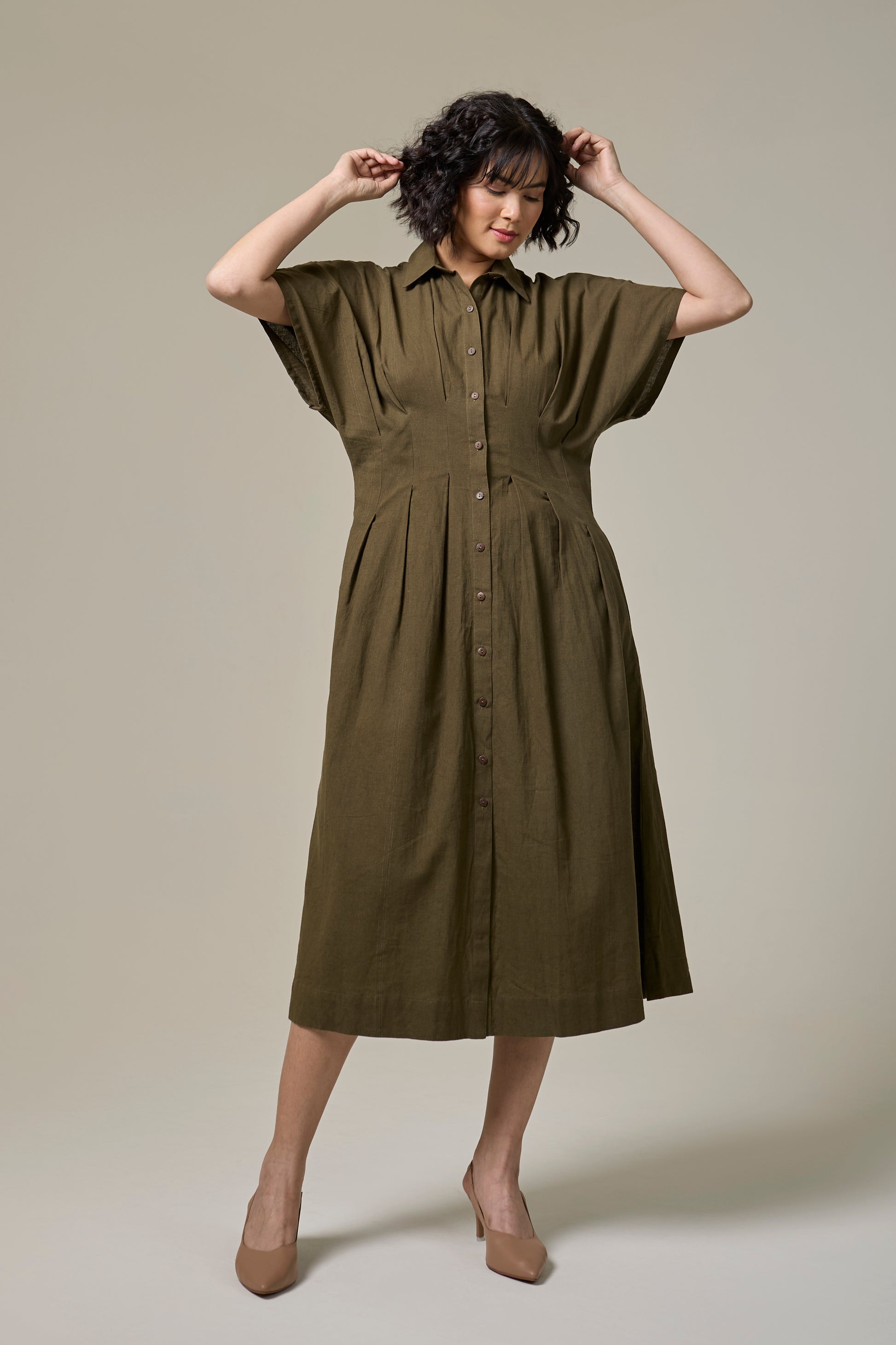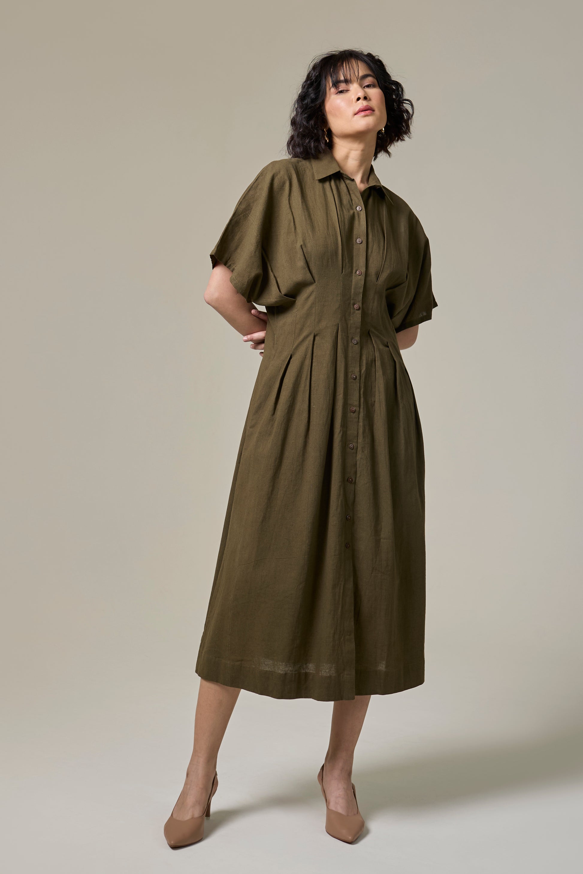 Made from a soft cotton-linen blend, this olive-hued dress features a flattering flare, subtle pleating, and a buttoned front for effortless structure. The voluminous sleeves and cinched waist elevate it for both workwear and serene evenings.
